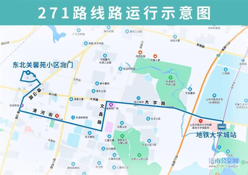 271路由地铁大学城站开往东北关馨苑小区北门,途经海棠路、大学路、文昌路、清河街、峰山路,沿途设置地铁大学城站、中医药大学、公交营运中心、乐天小区、八里庄、大学路凤凰路、文昌花苑、文昌路宾谷街、清河街小学、清河街经十西路、长清区政府、清河街五峰路、清河街峰山路、峰山路宾谷街、峰山路中川街、东北关馨苑小区(路北)、东北关馨苑小区北门(路南)站点。