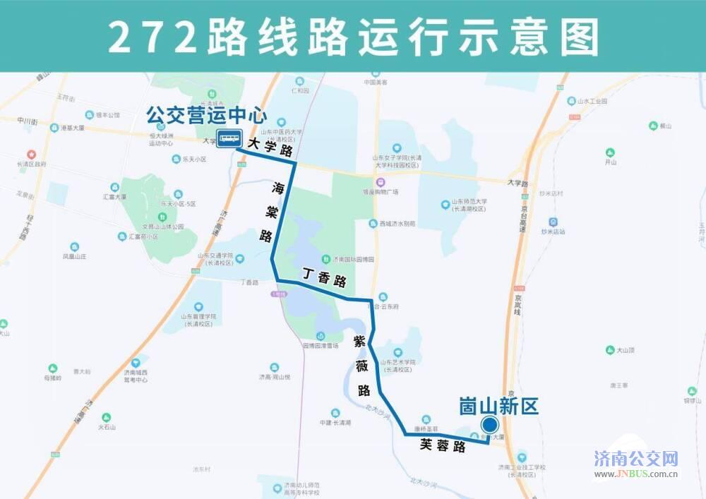 272路由公交营运中心开往崮山新区,途经大学路、海棠路、丁香路、紫薇路、芙蓉路,沿途设置公交营运中心、中医药大学、地铁大学城站、园博园西北门、地铁园博园站、原香溪谷、园博园南门、紫薇路丁香路(路西)、丁香路紫薇路(路北)、山东艺术学院、中建瀛园、康桥圣菲、华东师范大学济南实验学校、创新大厦、崮山新区南、崮山新区站点。