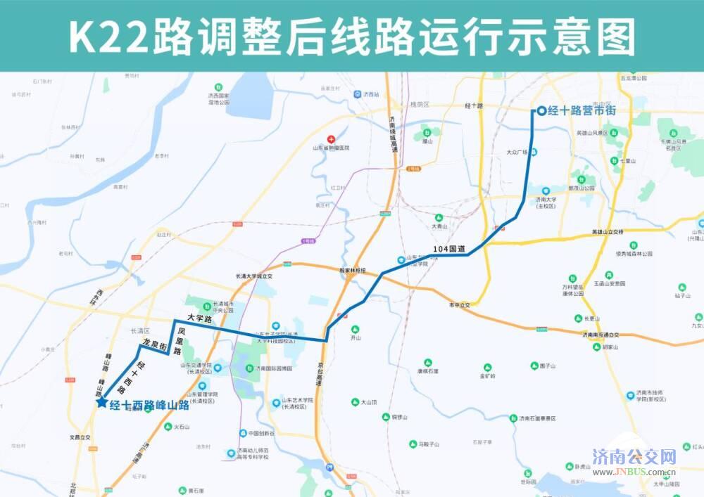 K22路优化调整后由经十西路峰山路开往经十路营市街,沿经十西路向北、龙泉街向东、凤凰路向北、大学路向东至104国道向北恢复原线,增设经十西路峰山路、经十西路苏和路、经十西路丹桂路、汇侨城、长清一中、龙泉街文昌路、长兴美郡、凤凰路清河街、凤凰路大学路、八里庄、乐天小区、公交营运中心(路南)站点。