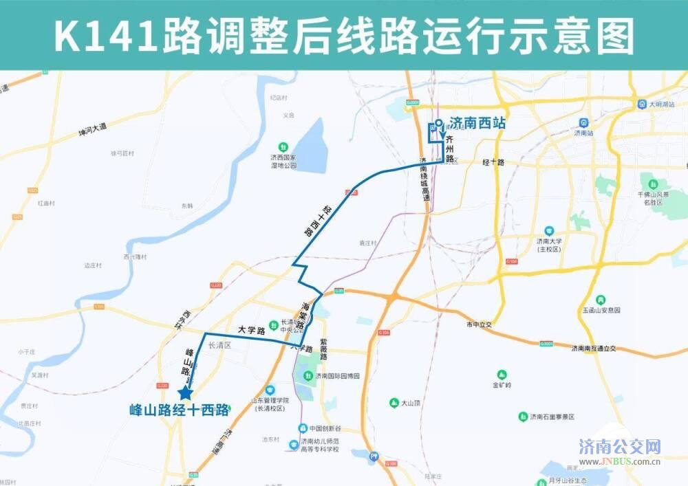K141路优化调整后由峰山路经十西路开往济南西站,沿峰山路向北、中川街向东、大学路向东,按现运行线路运行至齐州路,然后单向沿烟台路向西、齐鲁大道向北、日照路向东至齐州路向南恢复原线。增设峰山路经十西路、西苏庄、峰山路苏燕路、峰山路中段、峰山路阜新街、雅居花苑、长清区交警大队、鸣泉嘉园、峰山路清河街、峰山路宾谷街、中川街峰山路(路南)、中川街五峰路(路南)、烟台路齐州路(路北)、济南西站(路南)站点,撤销方特东方神画、济齐路非遗园东路(路南)、中赵庄、济齐路齐鲁大道(路北)、齐鲁大道德州路(路西)、齐鲁大道聊城路(路东)、地铁方特站、齐州路青岛路(路西)、青岛路齐州路(路北)、齐州路兴福寺路、济南西站东广场、齐州路烟台路(路东)、峰山路玉符街(路东)、玉符街中段(路南)、灵岩路玉符街(路西)站点。