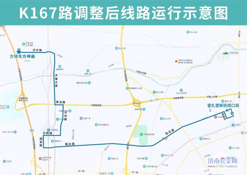K167路优化调整后由方特东方神画开往官扎营新街堤口路,沿济齐路向东、齐鲁大道向南、青岛路向东、齐州路向南至日照路向西恢复原线,增设方特东方神画、济齐路非遗园东路(路南)、中赵庄、济齐路齐鲁大道(路北)、齐鲁大道德州路(路西)、齐鲁大道聊城路(路东)、地铁方特站、齐州路青岛路(路西)、青岛路齐州路(路北)、齐州路兴福寺路、济南西站东广场、济南西站(路南)站点,撤销济南西站公交枢纽站点。