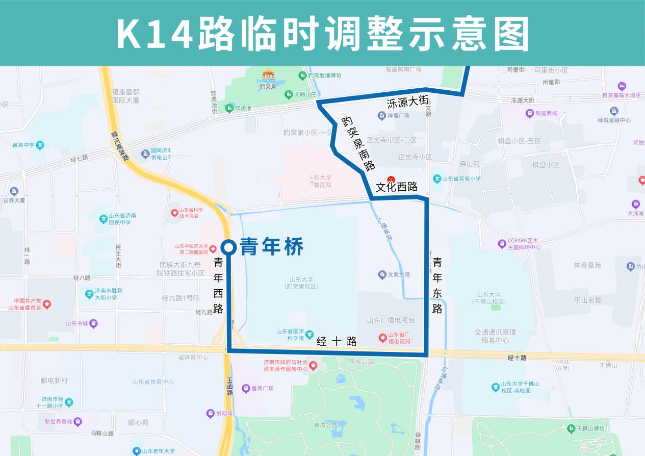 K14路夜间临时调整后沿趵突泉南路向南,然后单向沿文化西路向东、青年东路向南、经十路向西、青年西路向北恢复原线,临时撤销齐鲁医院(路北)、青年桥东(路北)站点。