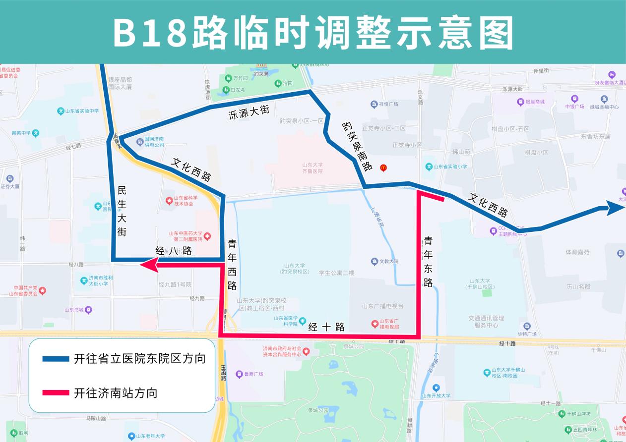 B18路夜间临时调整后开往济南站方向沿文化西路向西、青年东路向南、经十路向西、青年西路向北至经八路向西恢复原线;开往省立医院东院区方向沿青年西路向北、文化西路向西再向北、泺源大街向东、趵突泉南路向南至文化西路向东恢复原线。B18路临时撤销省中医(路北)、齐鲁医院、青年桥东站点。