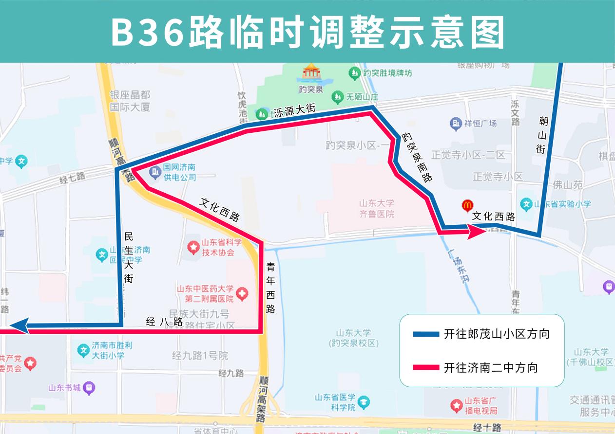 B36路夜间临时调整后开往济南二中方向沿青年西路向北、文化西路向西再向北、泺源大街向东、趵突泉南路向南至文化西路向东恢复原线;开往郎茂山小区方向沿文化西路向西、趵突泉南路向北、泺源大街向西、民生大街向南至经八路向西恢复原线。B36路临时撤销青年桥东、齐鲁医院、经八路青年西路(路北)。