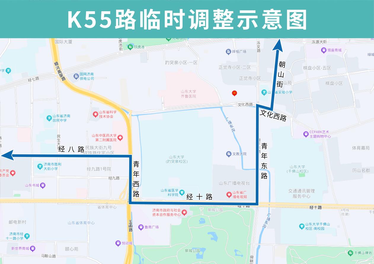 K55路临时调整后双向绕行文化西路、青年东路、经十路、青年西路、经八路,临时撤销齐鲁医院、青年桥东、青年西路(路东)站点。