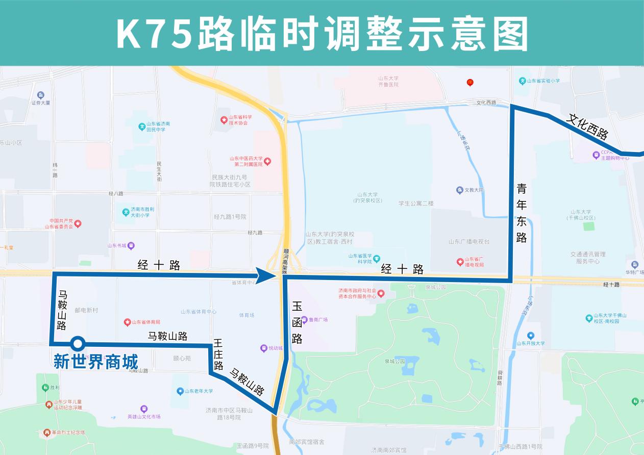 K75路夜间临时调整后开往新世界商城方向沿文化西路向西、青年东路向南、经十路向西至玉函路向南恢复原线;开往华山珑城公交车场方向沿经十路向东、青年东路向北至文化西路向东恢复原线。K75路临时撤销省中医、齐鲁医院、青年桥东、青年西路站点。