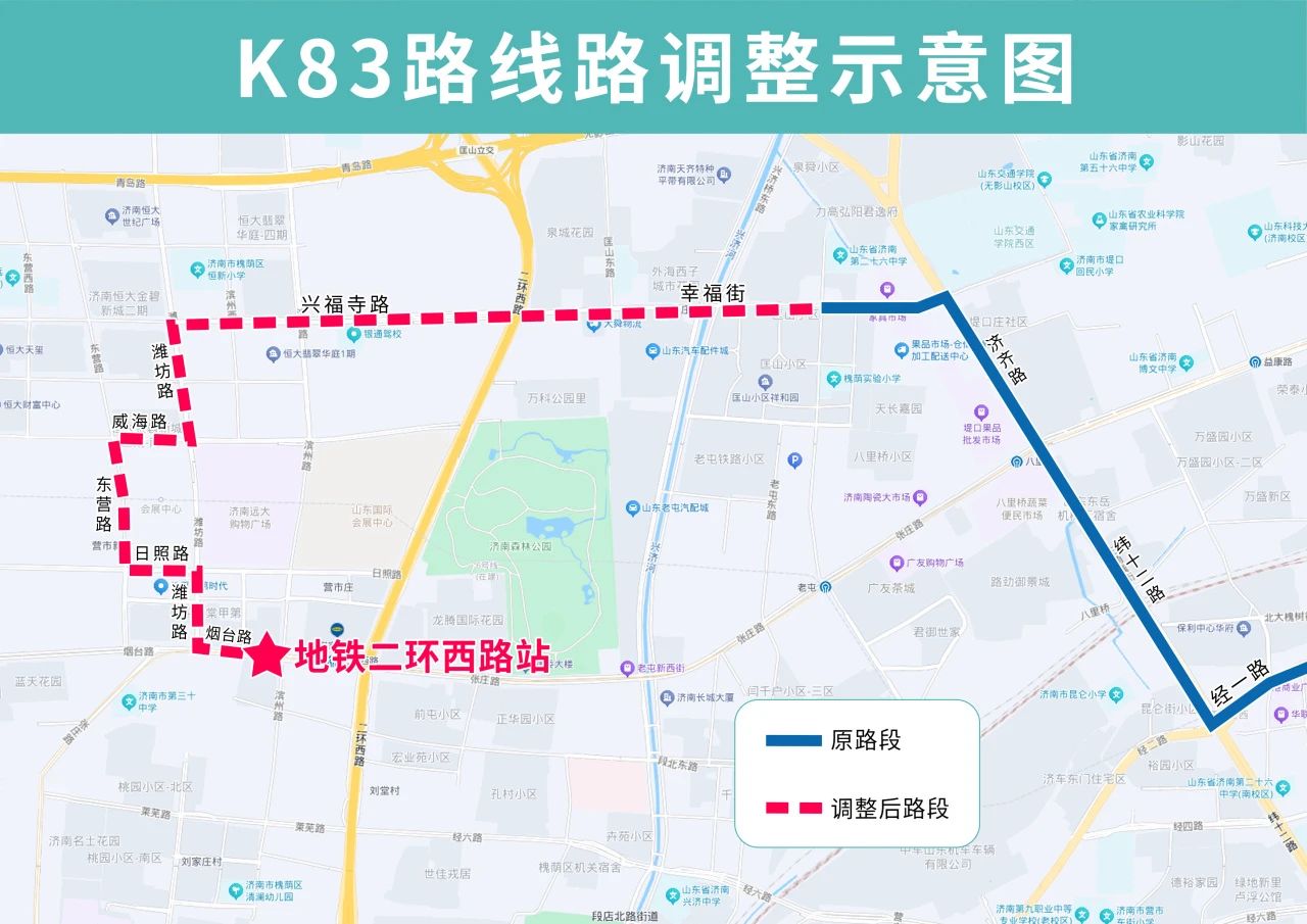 K83路优化调整后由地铁二环西路站开往解放桥,沿烟台路向西、潍坊路向北、日照路向西、东营路向北、威海路向东、潍坊路向北、兴福寺路向东至幸福街向东恢复原线,沿途增设地铁二环西路站、潍坊路烟台路、潍坊路兴福寺南路(路东)、兴福寺路潍坊路(路南)、潍坊路兴福寺路(路西)、兴福寺路滨州路、泉城花园南门、外海西子城市花园、匡山小区西站点。