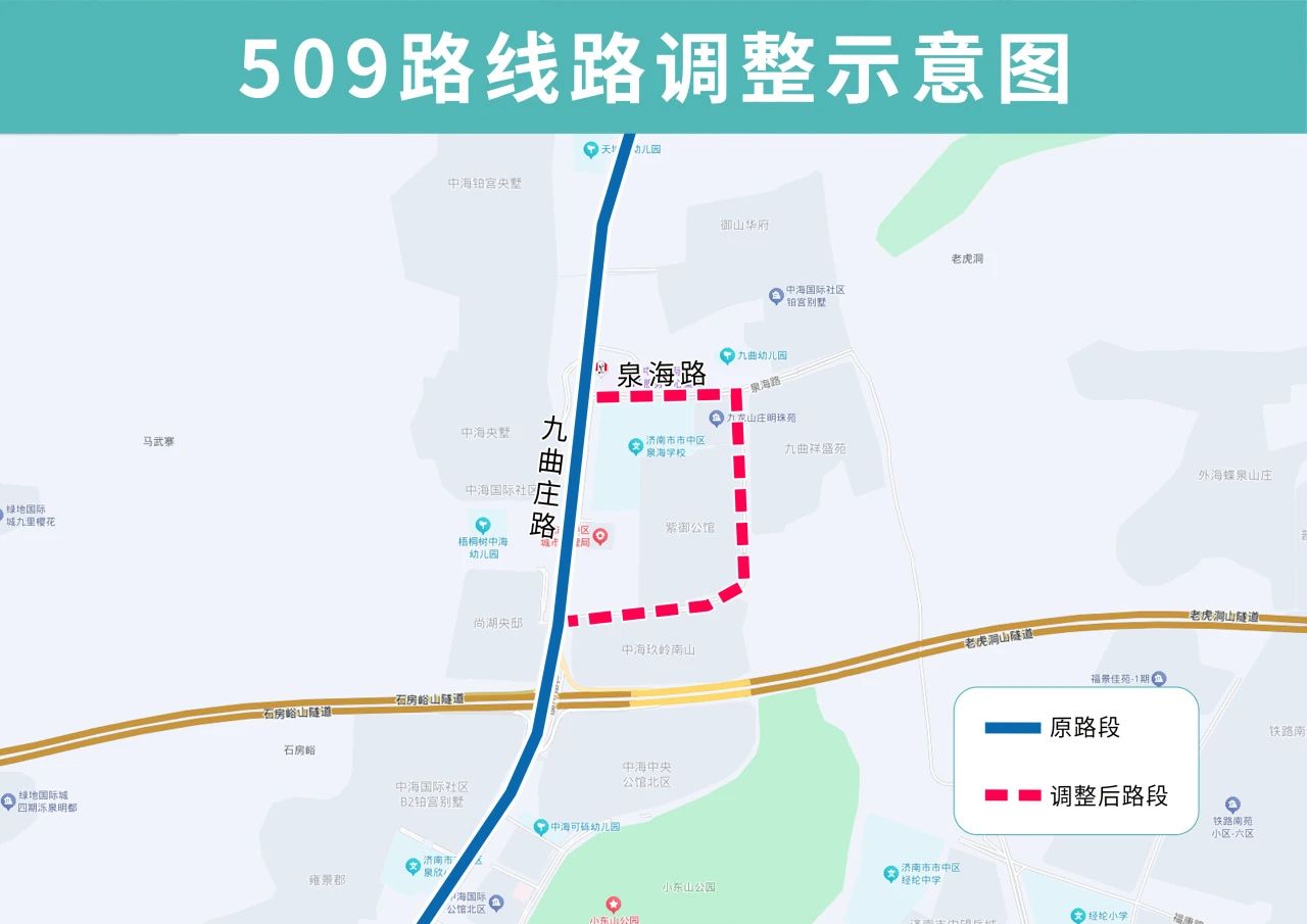 509路由西八公交车场开往中海御峰官邸,优化调整后沿九曲庄路向南、泉海路向东、社区道路向南再向西至九曲庄路向南恢复原线,沿途增设泉海学校、中海紫御公馆、中海玖岭南山站点,撤销九曲庄西、中海尚湖央邸站点。