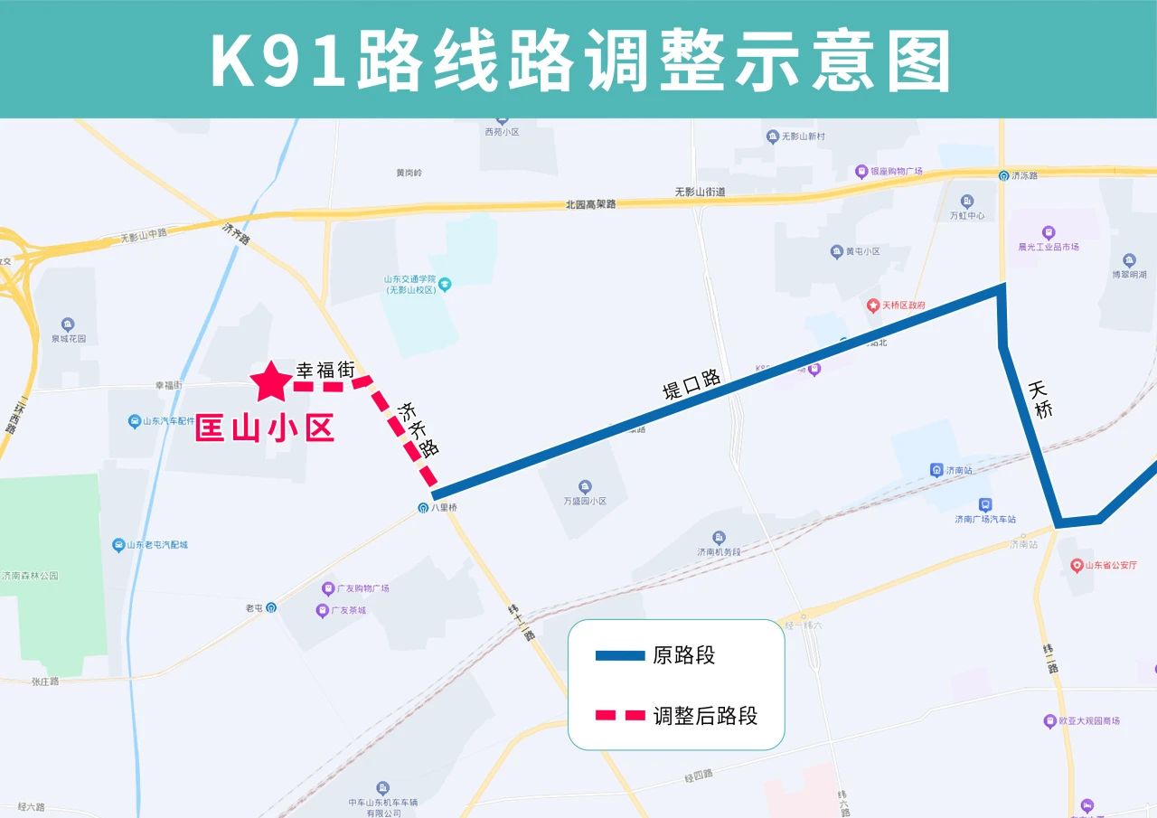 K91路优化调整后由匡山小区开往十里河,沿幸福街向东、济齐路向南至堤口路向东恢复原线,沿途增设匡山小区、济齐路交校路、济齐路张庄路(路东)站点,撤销地铁八里桥站(路南)、八里桥(路西)站点。