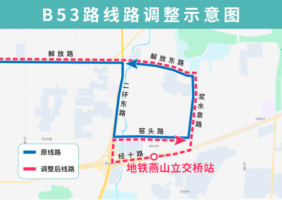 B53路优化调整后由大坝公交车场开往地铁燕山立交桥站,沿解放路向东、解放东路向东、浆水泉路向南、经十路向西、二环东路向北、窑头路向东至浆水泉路向北恢复原线,沿途增设解放东路二环东路(BRT南侧)、砚泉(BRT南侧)、浆水泉路解放东路(路西)、姚家小区(路西)、武警医院(路西)、地铁浆水泉路站(路北)、地铁燕山立交桥站(路北)、燕山立交桥北(路东)站点,撤销二环东路和平路(路西)站点。
