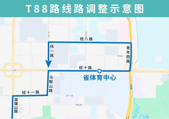 T88路优化调整后由仲宫开往省体育中心,沿马鞍山路向北、经十路向东、青年西路向北、经八路向西、纬一路向南至马鞍山路向南恢复原线,沿途增设省体育中心(路南)、经八路青年西路(路北)、经八路胜利大街(路北)站点,撤销经八路胜利大街(路南)、经八路青年西路(路南)站点。