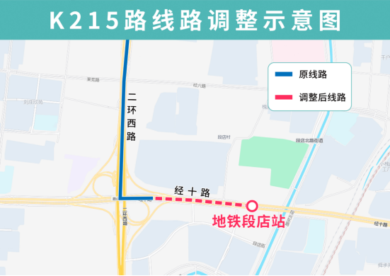 K215路优化调整后由齐州路聊城路开往地铁段店站,沿经十路向东至段兴东路调头返回,沿途增设地铁段店站站点。