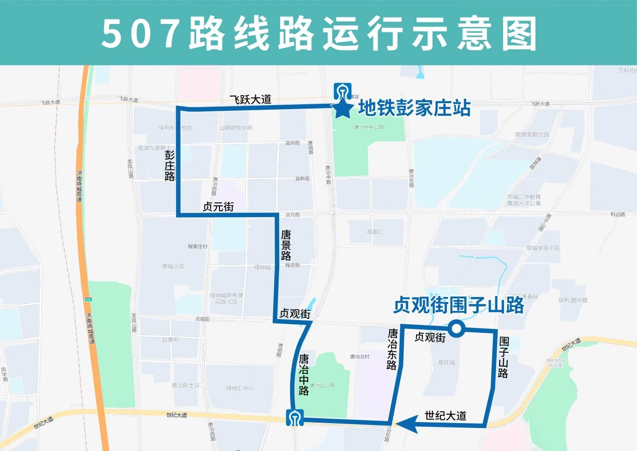 507路由地铁彭家庄站开往贞观街围子山路,主要途经飞跃大道、彭庄路、贞元街、唐景路、贞观街、唐冶中路、世纪大道,然后单向沿唐冶东路向北、贞观街向东、围子山路向南至世纪大道向西恢复原线,沿途设置地铁彭家庄站、飞跃大道唐冶西路、和唐悦色小区、彭庄路益新街、唐城小区北(路南)、贞元街唐和路、香树花城小区、新希望花园小区、世纪大道唐冶中路(路南)、地铁唐冶站(路东)、历城文博中心、唐冶东路世纪大道(路东)、高铁城(路南)、贞观街围子山路(路南)、围子山路贞观街(路西)、围子山路世纪大道(路西)、世纪大道围子山路(路北)站点。507路地铁彭家庄站发车时间为6:00-20:00,贞观街围子山路发车时间为6:20-20:20。票价一元,执行公交IC卡优惠政策。