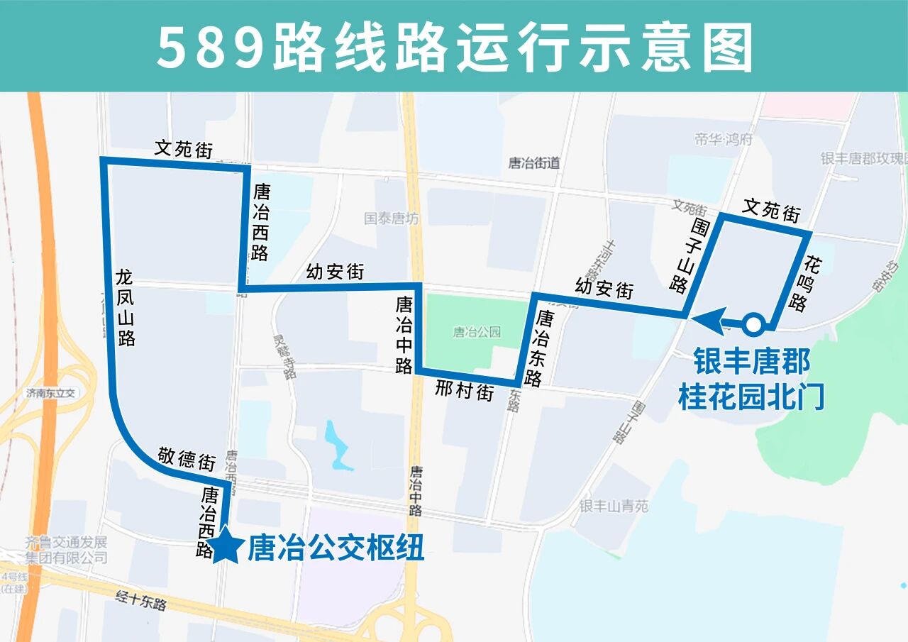 589路由唐冶公交枢纽开往银丰唐郡桂花园北门,主要途经唐冶西路、敬德街、龙凤山路、文苑街、唐冶西路、幼安街、唐冶中路、邢村街、唐冶东路、幼安街,然后单向沿围子山路向北、文苑街向东、花鸣路向南至幼安街向西恢复原线,沿途设置唐冶公交枢纽、唐官小区西门、文苑街唐春路、火炬东第(路西)、幼安街唐冶西路(路南)、唐冶西路幼安街(路东)、凤凰城北区、邢村街唐冶中路(路南)、地铁唐冶公园站(路东)、唐冶公园、银丰唐郡荷花园、济南润府(路东)、文苑街围子山路(路南)、银丰唐郡牡丹园(路西)、银丰唐郡桂花园北门(路北)站点。589路唐冶公交枢纽发车时间为6:00-20:00,银丰唐郡桂花园北门发车时间为6:20-20:20。票价一元,执行公交IC卡优惠政策。
