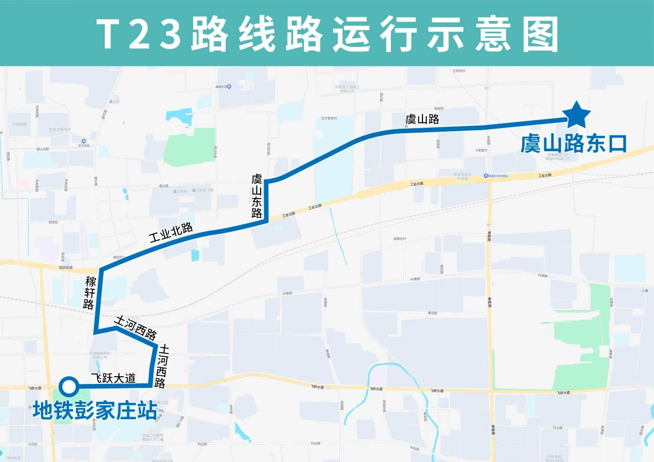 T23路由虞山路东口开往地铁彭家庄站,主要途经虞山路、虞山东路、工业北路、稼轩路、土河西路、飞跃大道,沿途设置虞山路东口、虞山路昭慧西路、虞山路昭文路、虞山路昭诚路、虞山路昭义路、山河逸墅小区、曹家馆虞山花园、虞山东路工业北路、山前村、地铁彭家庄站站点。