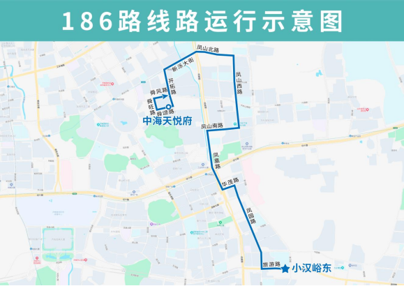 186路由小汉峪东开往中海天悦府,主要途经旅游路、凤园路、华茂路、凤凰路、凤山南路、凤山西路、凤山北路、新泺大街、开拓路,然后单向沿舜颂路向西、舜旺路向北、舜风路向东至开拓路向北恢复原线,沿途设置小汉峪东、中铁逸都国际城(路东)、凤园路华盛路、凤凰国际北区、凤园路华川路、凤园路龙奥北路、凤园路华茂路、凤凰路经十路、公交驾校、刘智远小区、银丰融和府、凤山西路凤山南路(路东)、燕玺中学、凤山西路长岭山路、恒大奥东新都西门、新泺大街东口、开拓路新泺大街(路西)、地铁开拓路站(路南)、开拓路舜风路、中海天悦府(路北)、舜风路舜旺路(路南)站点。