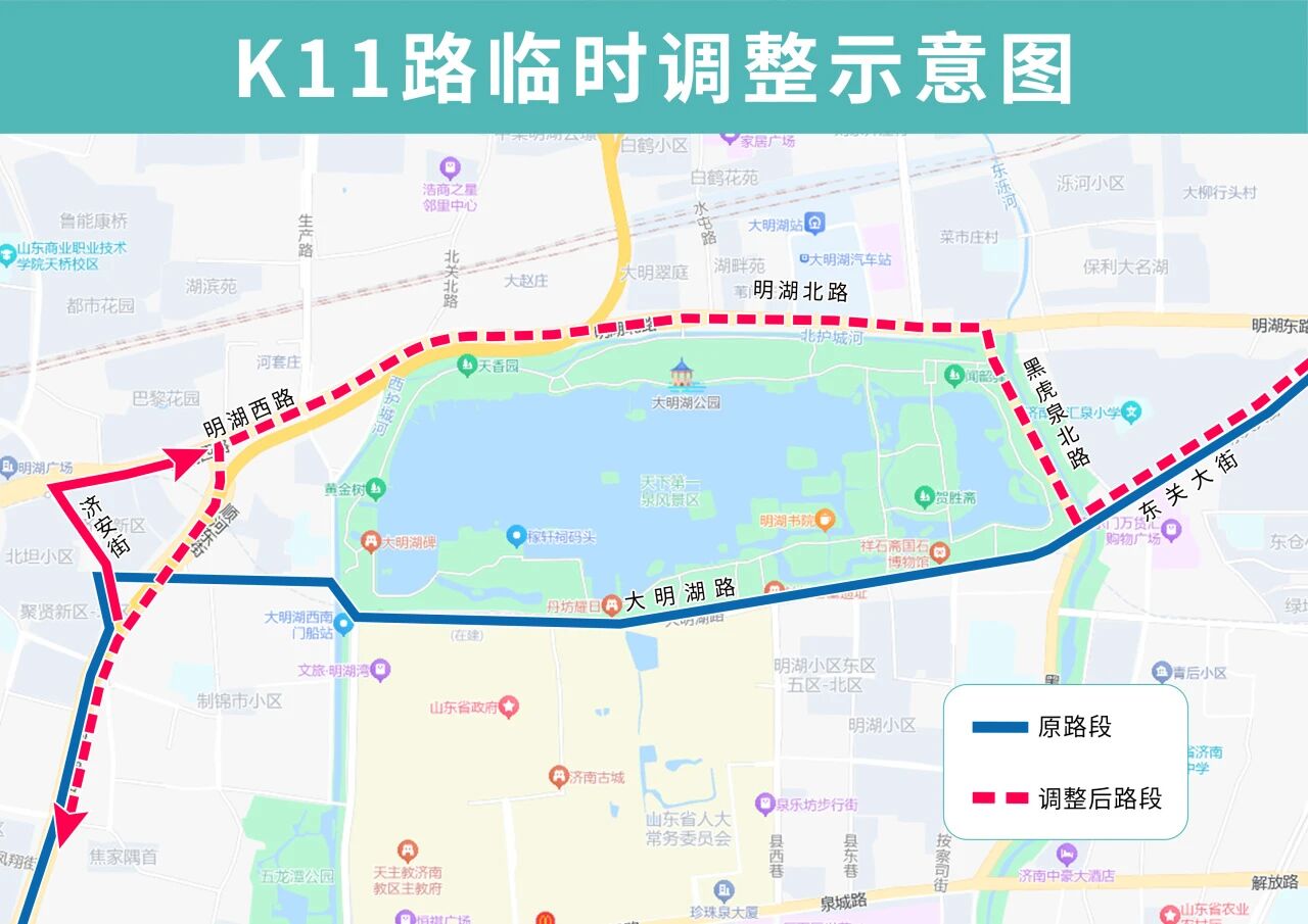 K11路K11路临时调整后沿东关大街向西、黑虎泉北路向北、明湖北路向西、明湖西路向西至顺河街向南恢复原线,临时撤销大明湖路按察司街、市立一院、大明湖、大明湖西南门、少年宫站点,临时增设大明湖东门、大明湖火车站、大明湖北门、北关、河套庄、明湖西路顺河街(路南)、济安街(路东)站点。