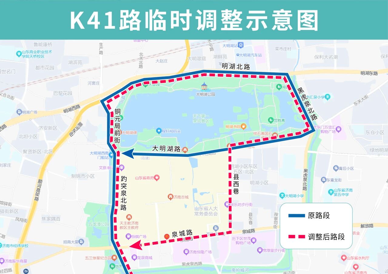 K41路K41路临时调整后沿铜元局前街向北,然后单向沿明湖北路向东、黑虎泉北路向南、大明湖路向西、县西巷向南、泉城路向西至趵突泉北路向南恢复原线,临时撤销大明湖(路北)、省府北门(路北)、大明湖西南门(路西)、西门(路西)站点,临时增设县西巷北口(路西)、县西巷南口(路西)、天地坛街(路北)、芙蓉街(路北)站点。