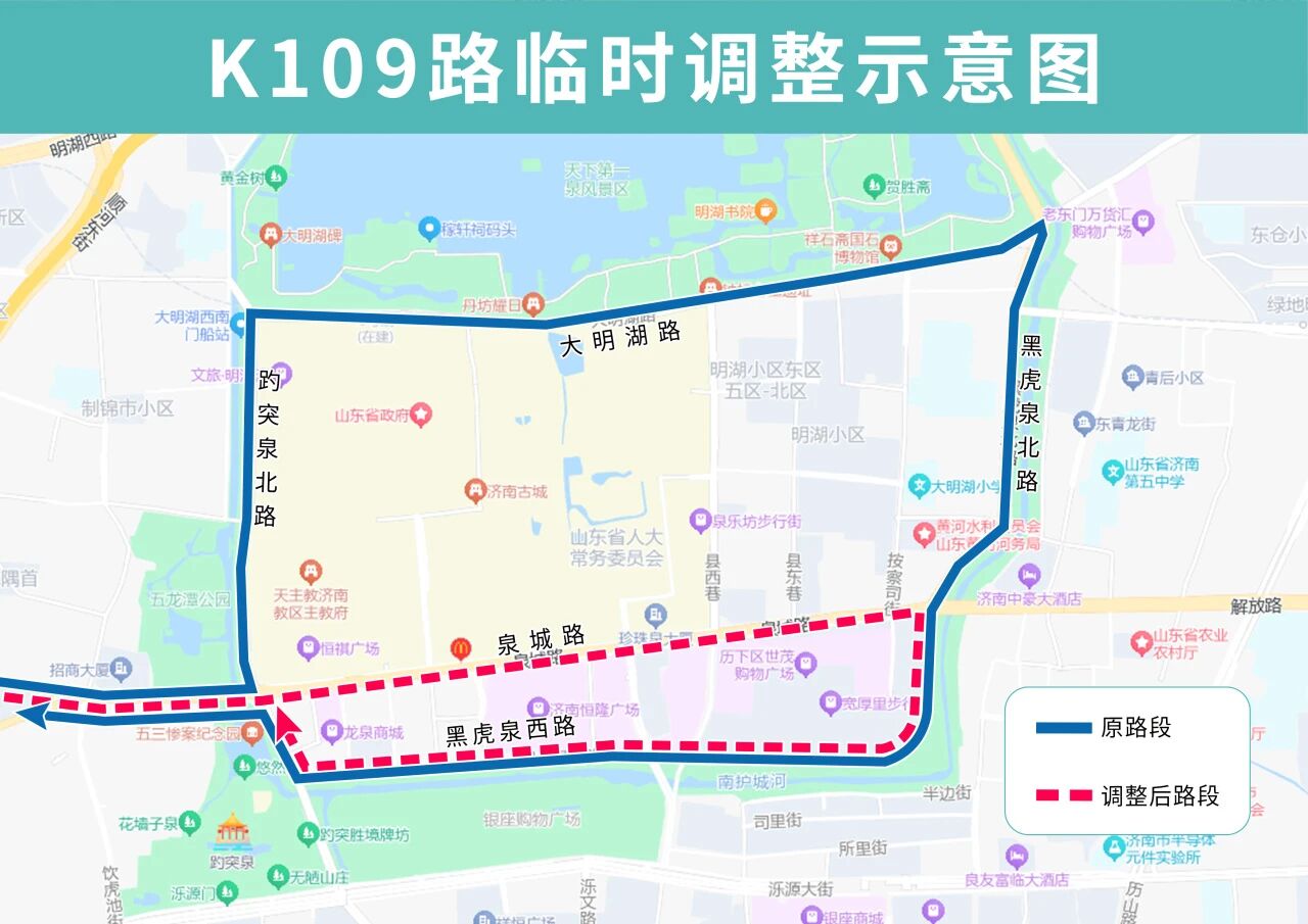 K109路K109路临时调整后由济南西站公交枢纽开往青龙桥,沿共青团路向东,然后单向沿泉城路向东、黑虎泉北路向南、黑虎泉西路向西、趵突泉北路向北至共青团路向西恢复原线,临时撤销西门(路东)、大明湖西南门(路南)、大明湖(路南)、市立一院(路南)、大明湖路按察司街(路南)、黑虎泉北路山大南路(路西)、青龙桥北(路西)站点,临时增设西门(路南)、芙蓉街(路南)、天地坛街(路南)、青龙桥(路南)站点。K109路济南西站公交枢纽发车时间为6:00-0:00,青龙桥发车时间为6:30-0:00。