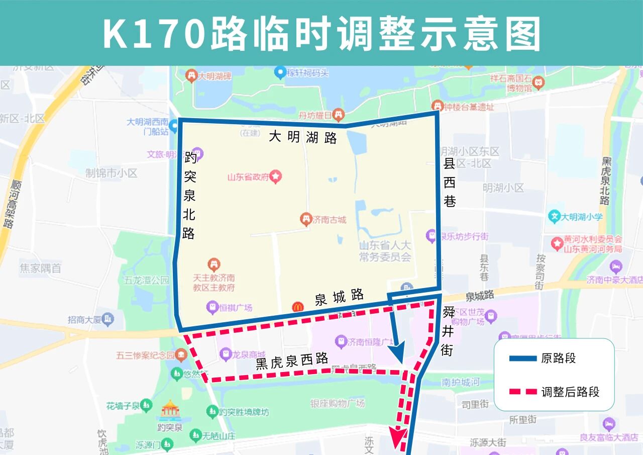 K170路K170路临时调整后由领秀城西门开往泉城广场北,沿南门大街向北,然后单向沿舜井街向北、泉城路向西、趵突泉北路向南、黑虎泉西路向东至南门大街向南恢复原线,临时撤销西门(路北)、大明湖西南门(路东)、省府北门(路南)、大明湖(路南)、县西巷北口(路西)、县西巷南口(路西)、天地坛街黑虎泉西路(路西)站点,临时增设趵突泉东门(路南)、泉城广场北(路南)站点。K170路领秀城西门发车时间为5:50-21:20,泉城广场北发车时间为6:40-22:10。