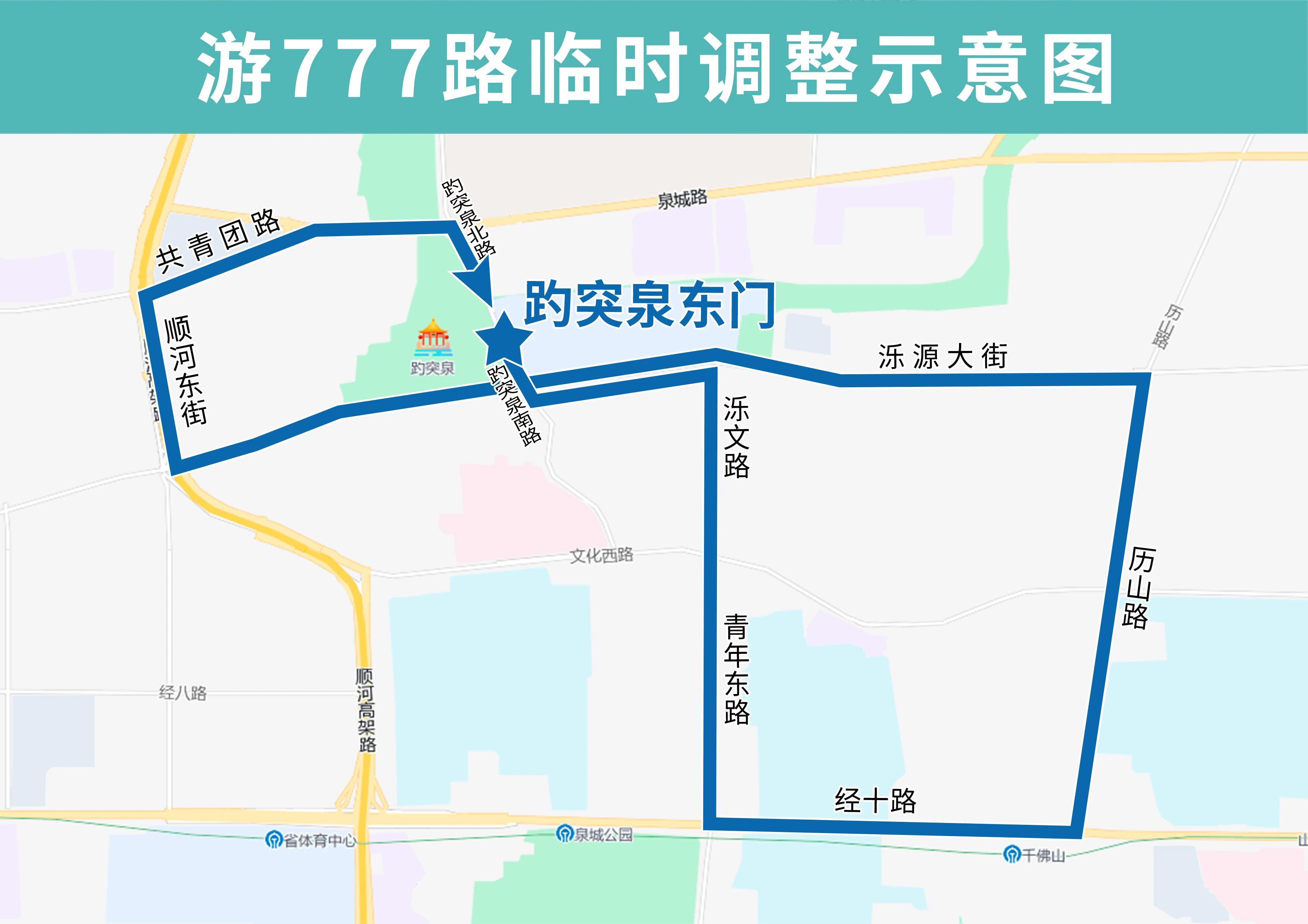 游777路游777路由趵突泉东门发车,临时调整后沿趵突泉南路、泺源大街、泺文路、青年东路、经十路、历山路、泺源大街、顺河东街、共青团路、趵突泉北路、趵突泉南路单向循环运行。沿途停靠趵突泉东门、千佛山、趵突泉南门站点。