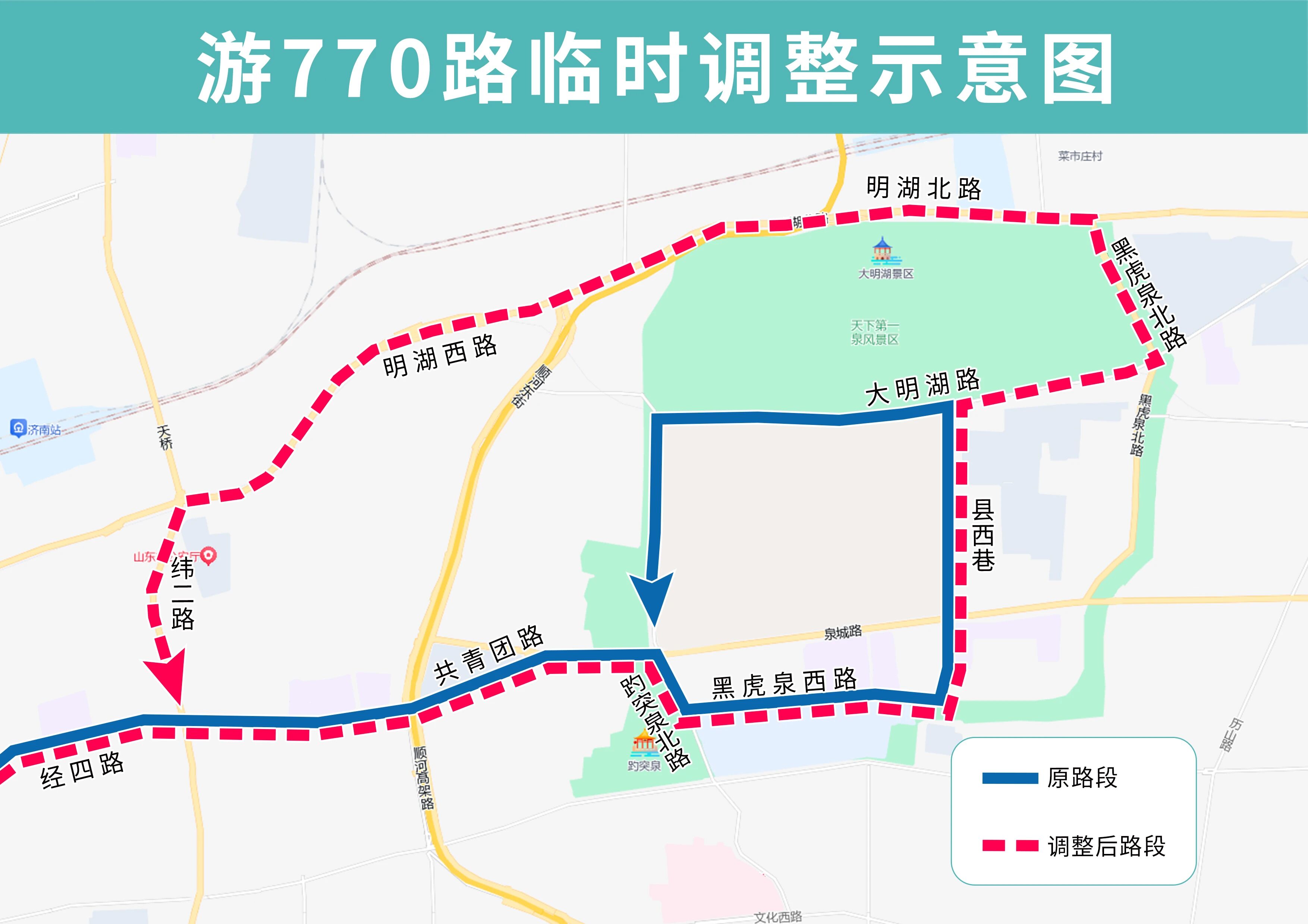 游770路游770路临时调整后沿县西巷向北、大明湖路向东、黑虎泉北路向北、明湖北路向西、明湖西路向西、纬二路向南至经四路向西恢复原线,临时撤销大明湖(路北)、趵突泉北门(路北)站点,临时增设市立一院(路南)站点。