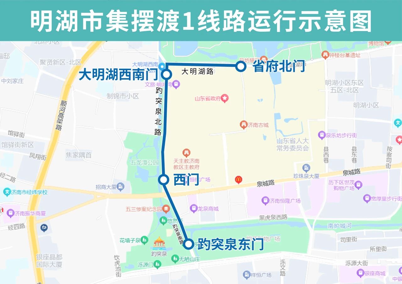 明湖市集摆渡1明湖市集摆渡1由省府北门开往趵突泉东门,沿途停靠省府北门、大明湖西南门、西门、趵突泉东门站点,营运时间为10:00-21:00,票价1元。