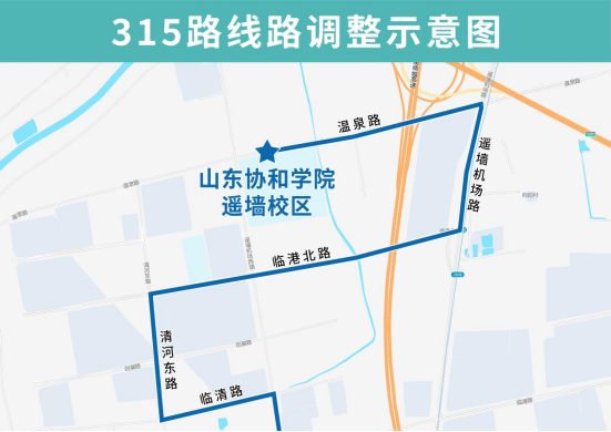 315路由山东协和学院遥墙校区开往全福立交桥,优化调整后沿温泉路向东、遥墙机场路向南、临港北路向西至清河东路向南恢复原线,沿途增设向阳村、地铁临港北路站、济南协和双语实验学校站点。