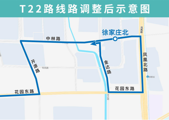 T22路由瀚裕华园开往徐家庄北,优化调整后沿花园东路向东、开源路向北、中林路向东,然后单向沿凤凰北路向南、花园东路向西、金达路向北至中林路向西恢复原线,沿途增设开源路中林路、中林路开源路(路南)、中林路宏宇路站点。