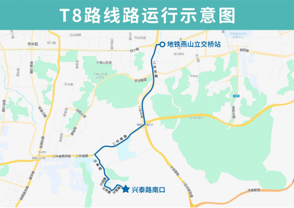 T8路由兴泰路南口开往地铁燕山立交桥站,主要途经兴泰路、兴智路、兴泽路、兴润路、兴泰路、二环南路、老虎山隧道、二环东路、经十路,沿途设置兴泰路南口、兴智路兴泰路(路西)、兴泰路兴智路(路南)、泉泽小学、泉泽中学、兴泰路二环南路、兴隆山庄西、山财大燕山校区、地铁燕山立交桥站站点。
