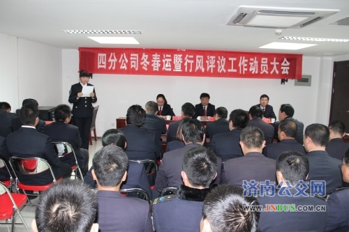 济南公交官网讯 11月11日下午,四分公司在西客站公交枢纽召开2013年冬春运暨行风评议动员大会,贯彻落实总公司动员大会精神和薛总讲话精神,公司全体职工要进一步振奋精神,全面完成冬春运各项保障任务。四分公司领导班子成员,所属各车队、各部室负责人及管理人员、驾驶员代表共70人参加会议。会议由四分公司党委副书记崔芳芳主持。