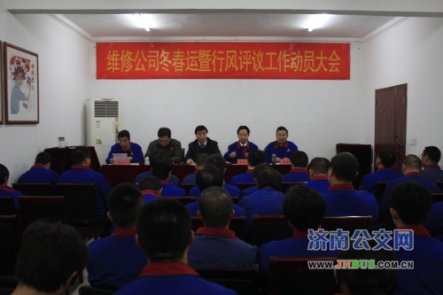 为贯彻落实总公司动员大会精神和薛总讲话精神,全面做好冬春运车辆保障工作和行风评议工作,11月11日下午,维修公司召开2013年冬春运暨行风评议工作动员大会。总公司副总经理石军、济南交通高级技工学校副校长潘富强率学生代表出席了会议。维修公司班子成员和部分职工代表共50余人参加了会议。公司党委书记、工会主席高新传主持了会议,并传达了总公司行风评议工作精神。