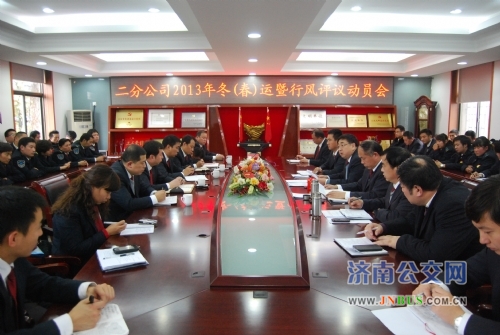济南公交官网讯 为认真贯彻总公司冬春运暨行风评议动员大会要求和薛总的重要讲话精神,对二分公司冬春运工作及行风建设工作进行动员和部署, 11日下午,二分公司召开2013年冬春运暨行风评议工作动员会。二分公司班子成员、各部室负责人、车队管理人员及驾驶员代表共计70余人参加了会议,会议由二分公司党委副书记、纪委书记、工会主席于建民主持。