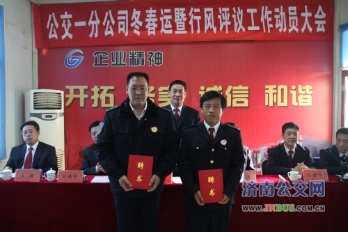 会上,副经理杨增勇宣读了《一分公司2013年冬(春)运工作实施方案》;党委书记赵德荣传达了市行风评议工作会议精神并宣读了《一分公司“抓服务、保安全、促行风”冬春运竞赛活动方案》;副经理孔建华宣读了《一分公司关于聘任王广成等同志为高技能人才的通知》,李总为高技能人才代表颁发了聘书;四队队长安华永、六队安全员李政、一队调度员秦静、二队机务员路刚、五队服管员刘欣、三队驾驶员管立峰分别作了表态发言,公司团委向全体团员青年发出倡议。