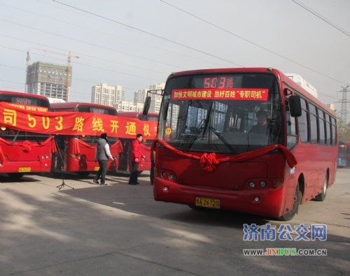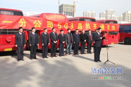 济南公交官网讯 为贯彻落实十八大精神,加快科学发展,方便市民出行,11月26日济南公交503路公交线正式开通。上午11时18分,公交一分公司503路线开通剪彩仪式在公交姚家车场隆重举行。总公司党委副书记刘波,总公司司副总经理李双喜、谢刚,总公司营运市场部副部长孙涌以及乘客代表,一分公司班子成员、各级管理人员及职工代表共计100余人参加了仪式。