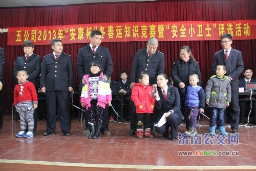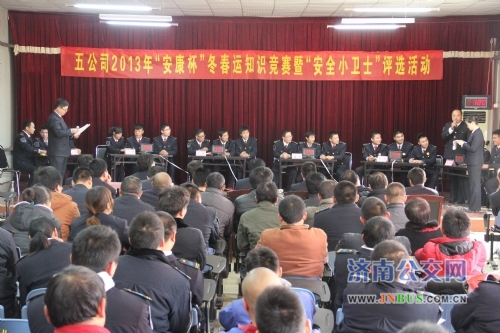 济南公交官网讯 为了营造浓厚的安全管理氛围,促进冬运工作的深入开展,进一步提升驾驶员的安全行车意识,五分公司于11月27日组织开展了2013年“安康杯”冬春运知识竞赛暨“安全小卫士”评选活动。总公司工会主席张栩、副总经理姜良、安全保卫部副部长尹晓伸出席了活动。