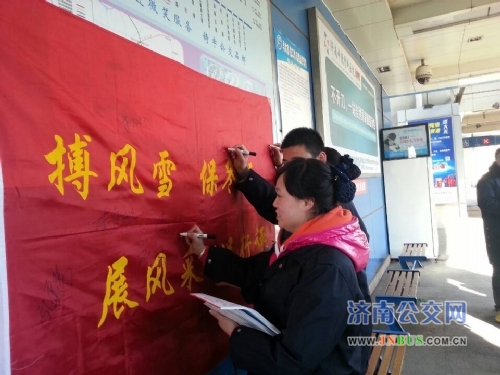 高星级站务员赵颖君、孔夏梦、李鲁鹏、潘歆、王德虎、高婧等十余人一起在“搏风雪保冬运 展风采 促行评”旗帜上郑重签下自己的名子,决心为冬运、行评工作打好攻坚战。随后,站务员在站台开展便民服务,发放便民乘车图,提供导乘服务,方便市民出行;通过让乘客填写满意度调查表,广泛征求市民乘客的意见和建议,完善站台服务工作。贴心的服务,真诚的话语像冬日里的暖阳,让乘客在寒冷中感到温暖。党委书记李琳参加了此次活动,并就站台冬运、行评工作如何发挥青年突击队作用提出了期望和要求,为打好冬运攻坚战鼓舞了职工士气,促进了行风评议工作再上新台阶的信心。