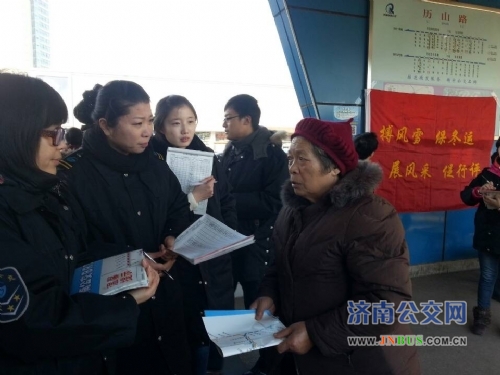 济南公交官网讯 近日寒潮来袭,为做好冬运、行评工作,提升站台服务水平,28日下午,七分公司站务管理部组织站务员在历山路站台开展便民乘车服务活动。