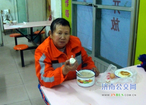 此前,公交四公司二队副书记丁益与匡山社区环卫所取得了联系,希望在天冷的时候能够为辖区的环卫工人在车队食堂免费提供早餐。28日早晨,丁益与车队职工一起为环卫工人盛甜沫、准备鸡蛋和菜饼。能够吃热、吃好,环卫工人李阿姨很感动,用她的话说“吃的很热、很饱,公交公司真好!”