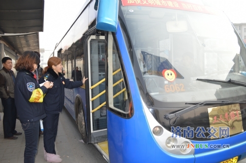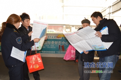 车队组织驾驶员到客流集中站点、站台发放《济南市公交乘车指南》和《车队便民服务卡》,向市民宣传安全乘车常识等。