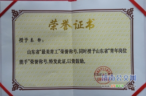 为深入贯彻落实党的十八大精神和习近平总书记关于中国梦的一系列重要讲话精神,在各级各类岗位练兵、技能竞赛、创新创效活动及青年岗位能手中发现和推出一批爱岗敬业、奉献成长的一线青年职工典型,共青团山东省委按照团中央部署,在全省范围内深入开展了 “岗位技能促振兴,青春建功中国梦”寻找“最美青工”活动。济南公交总公司团委积极参与到活动当中,在全公司范围内广泛发动、全面寻找,最终将35路驾驶员秦静推荐到团省委参与评选。秦静的事迹材料顺利通过了初审,进入到网络投票环节,并以36151的高票数,位居济南市“最美青工”候选人的网络票选榜首。经过评委会审核评定,秦静同志被授予山东省“最美青工”荣誉称号,同时授予山东省“青年岗位能手”荣誉称号。