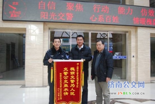 济南公交官网讯 1月4日上午,二分公司副经理李玉涛及汽车六队管理人员来到槐荫交警大队交通科,为其送上了写有“槐荫交警为人民,交警公交鱼水情”的锦旗。