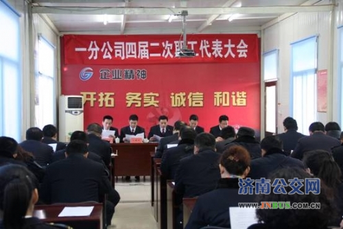 济南公交官网讯 1月27日上午,一分公司在姚家车场会议室召开四届二次职工代表大会。一分公司班子成员、机关部室负责人、车队队长、副书记及职工代表共计60余人参加了职代会。会议由一分公司党委书记、工会主席赵德荣主持。