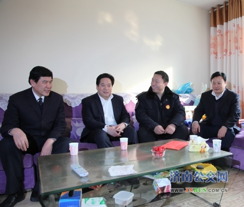 济南公交官网2014年1月24日讯 1月23日下午,市交通运输局副局长、公交总公司党委书记、总经理薛兴海在总公司党委副书记刘波,总公司工会主席张栩、副主席尹萍等陪同下,分别走访慰问了刘基生、季凤祥、郗志强三位老干部和四公司患病困难驾驶员刘宝峰及困难劳模李玉娥两位困难职工,给他们送去节日的问候和良好的祝愿。