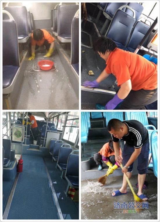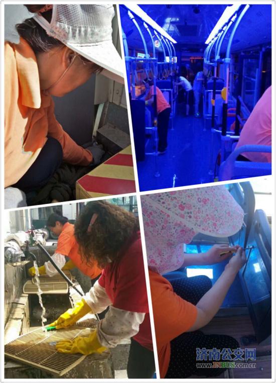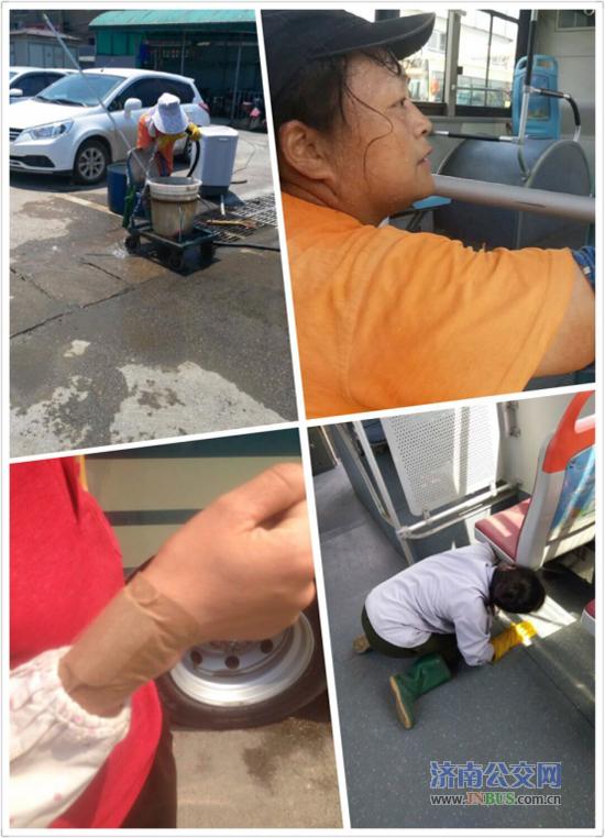 顶着炎炎烈日,保洁员汗流浃背,全力清理车辆卫生死角,为了能够及时完成车辆保洁任务,保洁员甚至来不及到保洁室喝口水,直接饮用水管自来水。在保洁员加班加点、不懈奋战的努力下,在车队人员和维修人员的大力协助下,物业保洁分公司已对大部分车辆卫生死角进行了清刷,已对部分站点的车内座椅后背广告处及后置显示屏后风挡部位进行了清洁。物业公司保洁分公司利用车辆一级维护停驶期间,陆续对其它站点车辆进行清洁,确保车辆卫生达到创城工作要求。