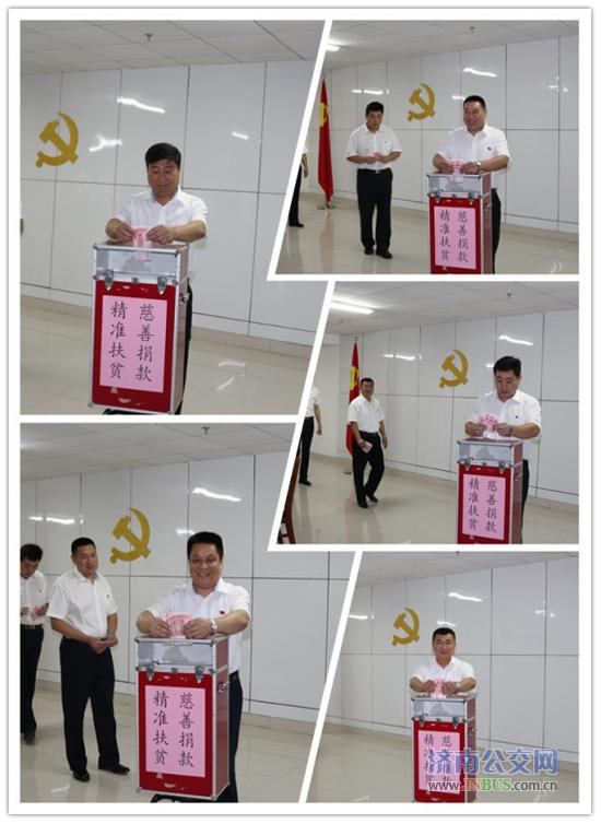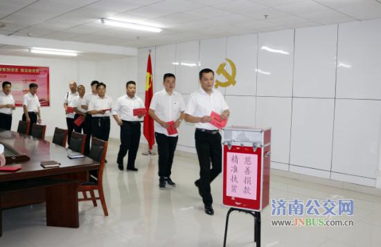济南公交官网讯 按照总公司慈善工作站《关于开展2017年精准扶贫慈善捐款的通知》要求,为进一步弘扬中华民族团结友爱,扶贫济困的传统美德,6月16日上午,三分公司组织开展2017年精准扶贫慈善捐款活动,公司班子成员,机关全体管理人员及各车队职工代表参加活动。