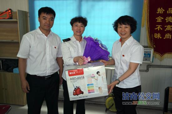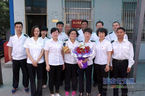 济南公交官网讯 2017年6月27日,当BRT2号线驾驶员韩英驾车回到北关停车场时,看到一群同事向她走来,队长韩书元将一捧鲜花送到她手中,原来今天是韩英正式退休的日子。