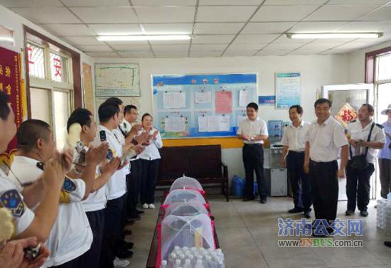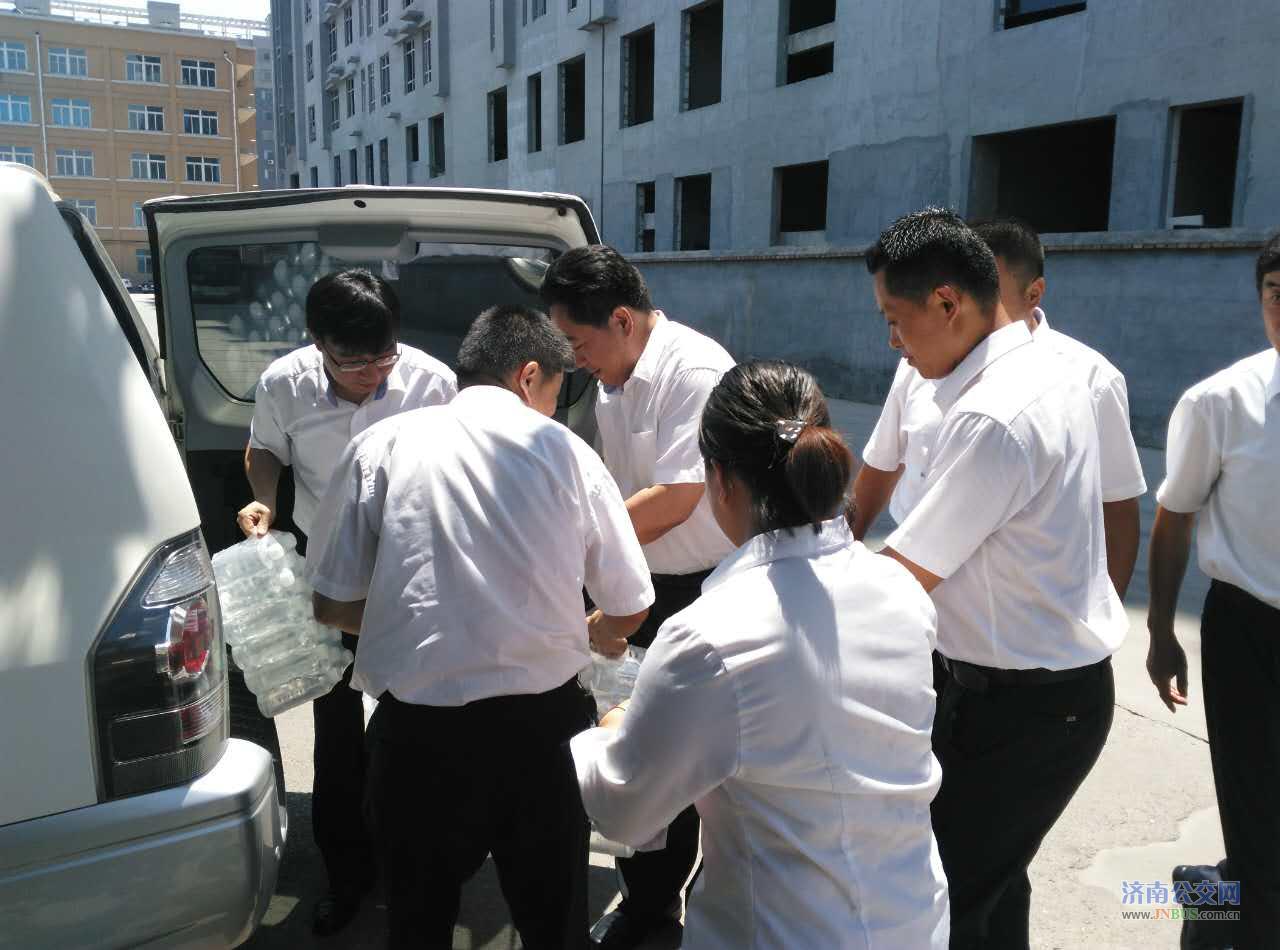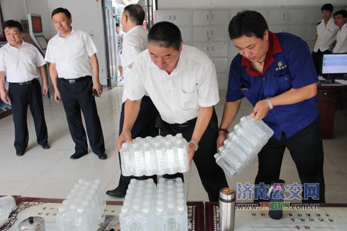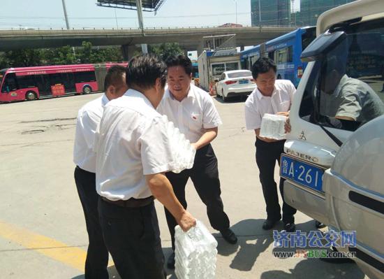 济南公交官网讯 炎炎夏日,骄阳似火,自入夏以来,济南气温急剧上升,总公司党委心系一线职工。 7月11日中午12点多,总公司副总经理石绍滕、金建勇冒着高温酷暑,分别来到五分公司一队、五队站点、腊山立交桥117路站点、姚家103路站点,为一线职工送来了一瓶瓶清凉的矿泉水,并向职工转达了总公司党委的关怀。总公司领导每到一处,看到车队都能按照总公司的要求为职工提供干净舒适的休息环境,为员工提供良好的后勤保障服务,给与了充分的肯定。同时,叮嘱驾驶员要保重身体,在创城的关键时刻,做到文明驾驶,遵章守法,以优质的服务为创城贡献一份力量。