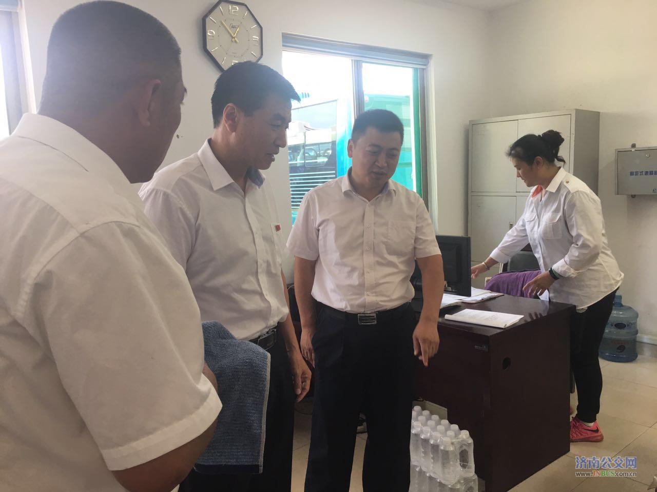 中午时分,总公司党委书记、总经理薛兴海,副总经理石军、颜廷虎冒着炎炎烈日分别来到了六分公司三队和六队看望慰问职工,为职工带来矿泉水和总公司党委的关怀。薛总登上公交车辆对车队创城工作进行检查指导,并嘱咐大家在做好工作的同时注意身体,对大家的辛勤付出表示感谢,叮嘱车队继续加强驾驶员安全文明行车的教育引导,并做好防暑降温工作。