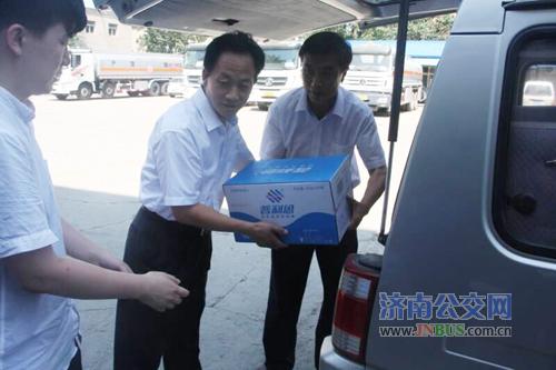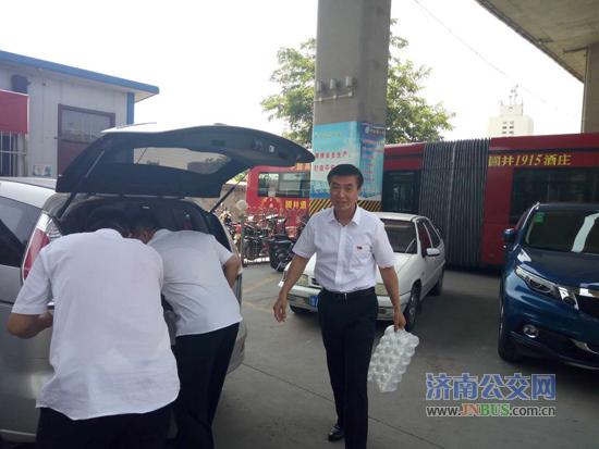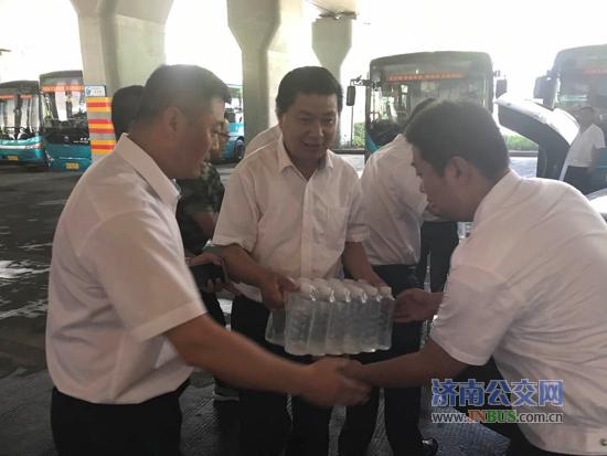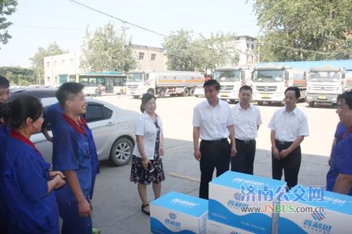 济南公交官网讯 7月11日中午总公司领导来到七分公司,看望高温天气下坚守岗位的一线职工,给大家送来了矿泉水,并代表总公司党委对职工表示亲切的慰问。